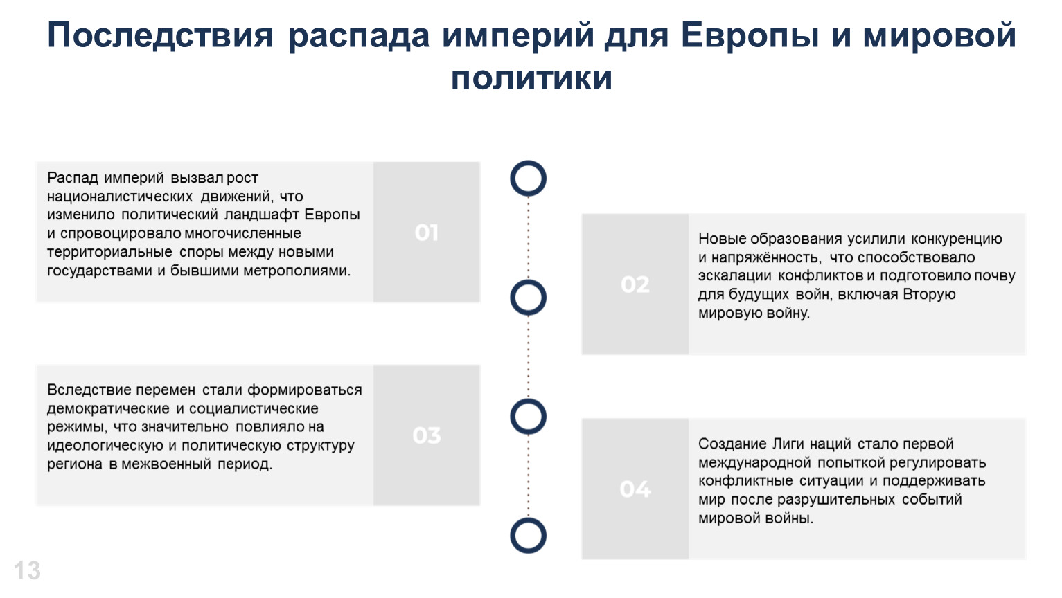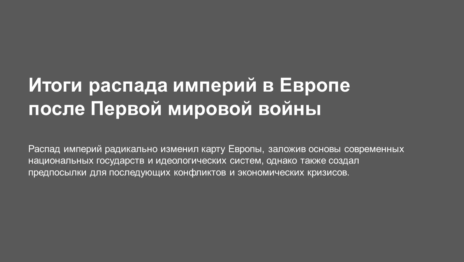 Распад империй вызвал рост националистических движений, что изменило политический ландшафт Европы и спровоцировало многочисленные территориальные споры между новыми государствами и бывшими метрополиями.