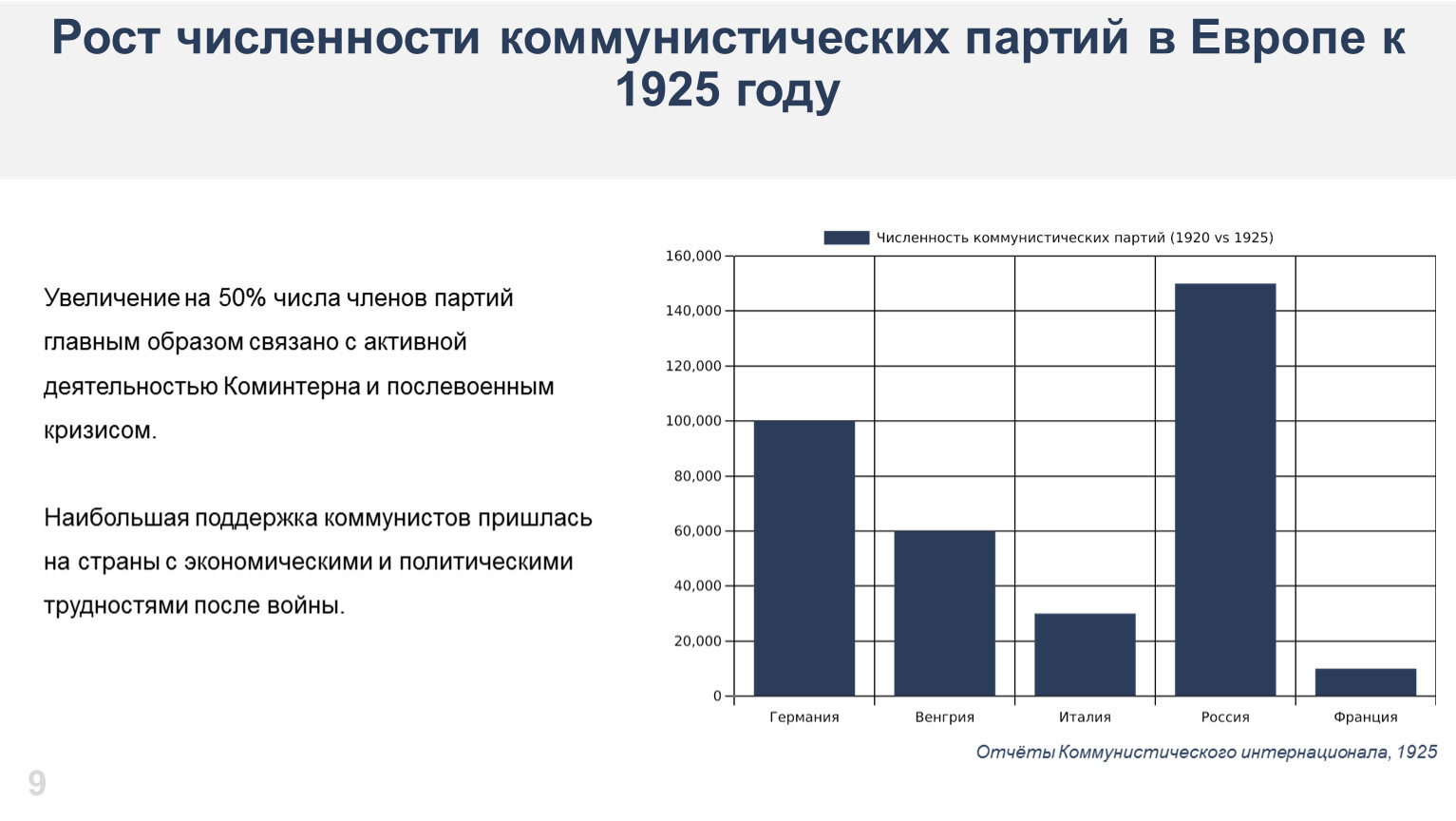 Увеличение на 50% числа членов партий главным образом связано с активной деятельностью Коминтерна и послевоенным кризисом. Наибольшая поддержка коммунистов пришлась на страны с экономическими и политическими трудностями после войны.
