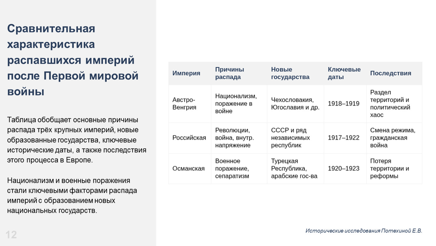 Сравнительная характеристика распавшихся империй после Первой мировой войны Таблица обобщает основные причины распада трёх крупных империй, новые образованные государства, ключевые исторические даты, а также последствия этого процесса в Европе. Национализм и военные поражения стали ключевыми факторами распада империй с образованием новых национальных государств.