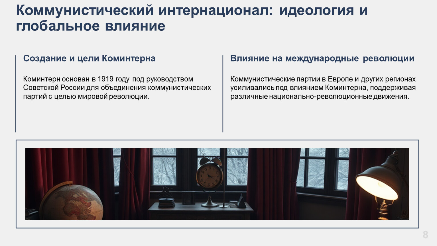Создание и цели Коминтерна Коминтерн основан в 1919 году под руководством Советской России для объединения коммунистических партий с целью мировой революции.