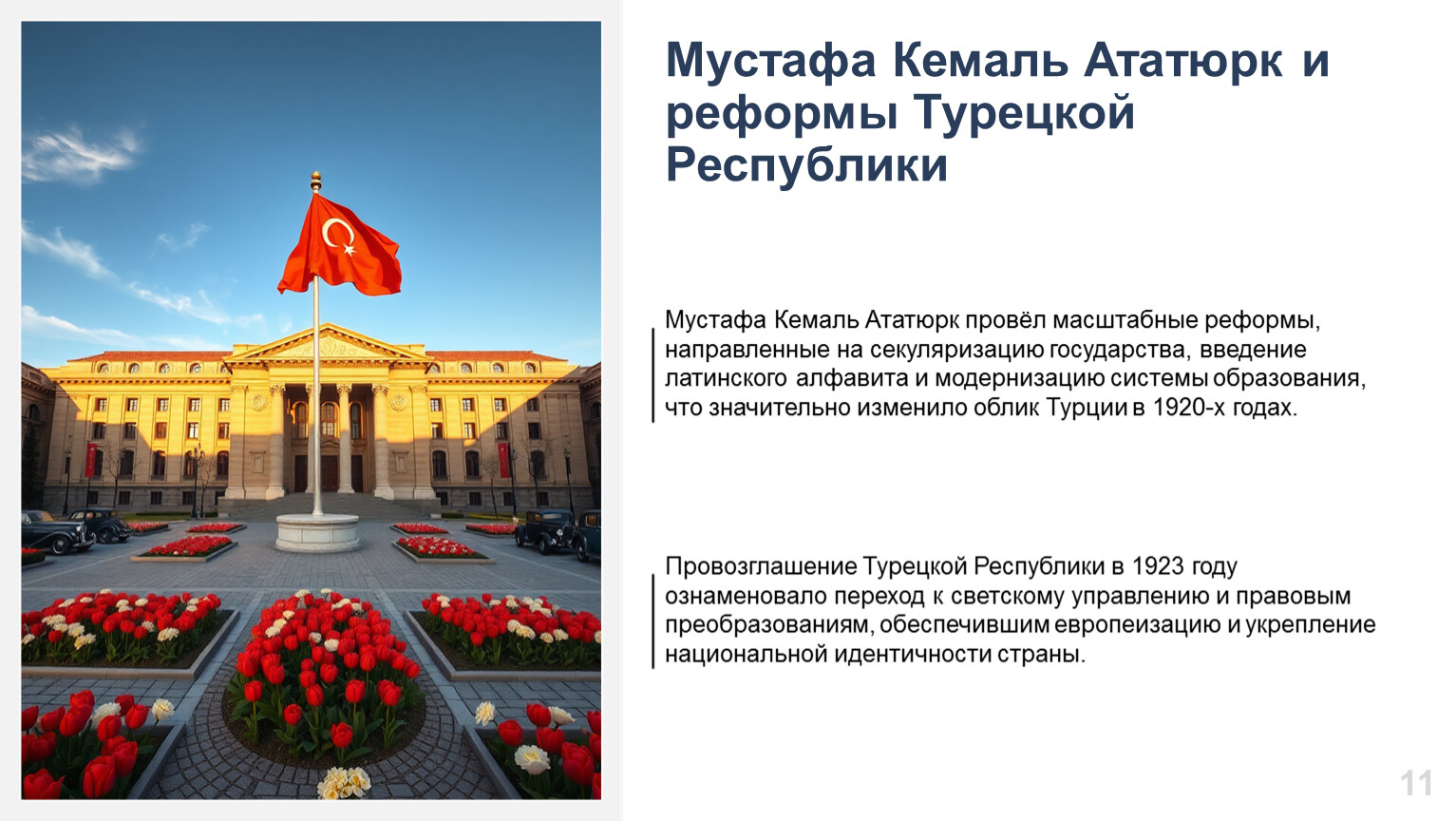Мустафа Кемаль Ататюрк провёл масштабные реформы, направленные на секуляризацию государства, введение латинского алфавита и модернизацию системы образования, что значительно изменило облик Турции в 1920-х годах.