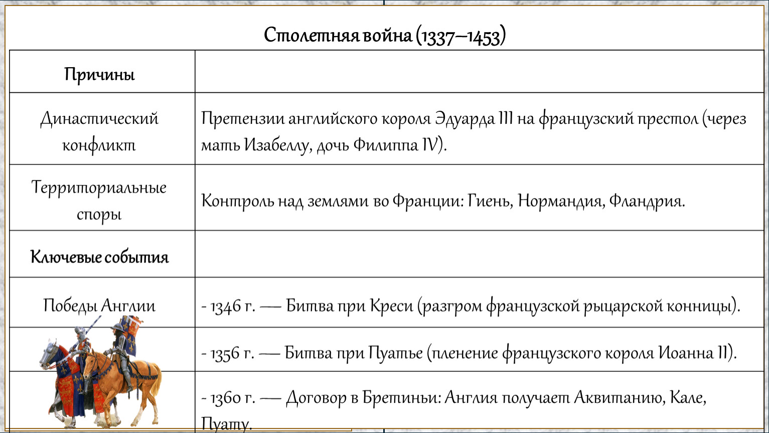 Итог | - 1453 г. — Англия теряет все владения во Франции, кроме Кале. |