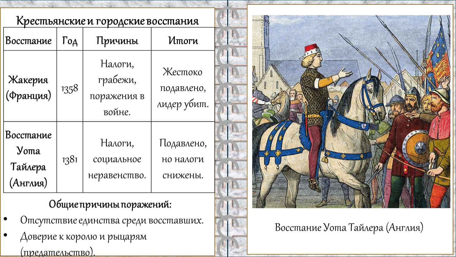 Восстание Уота Тайлера (Англия) | 1381 | Налоги, социальное неравенство. | Подавлено, но налоги снижены. |