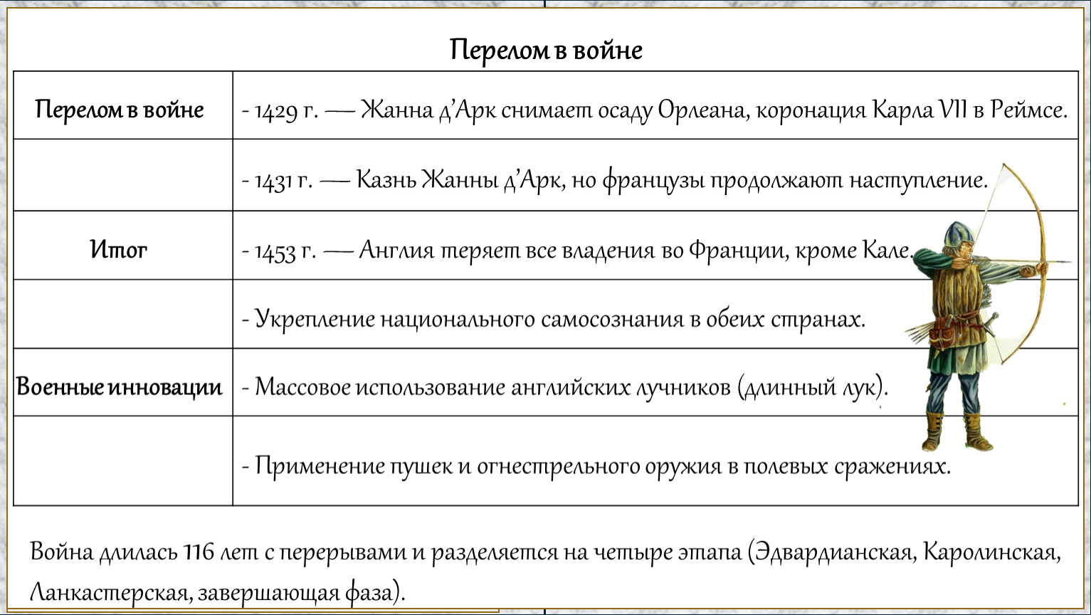 Перелом в войне | - 1429 г. — Жанна д’Арк снимает осаду Орлеана, коронация Карла VII в Реймсе. |