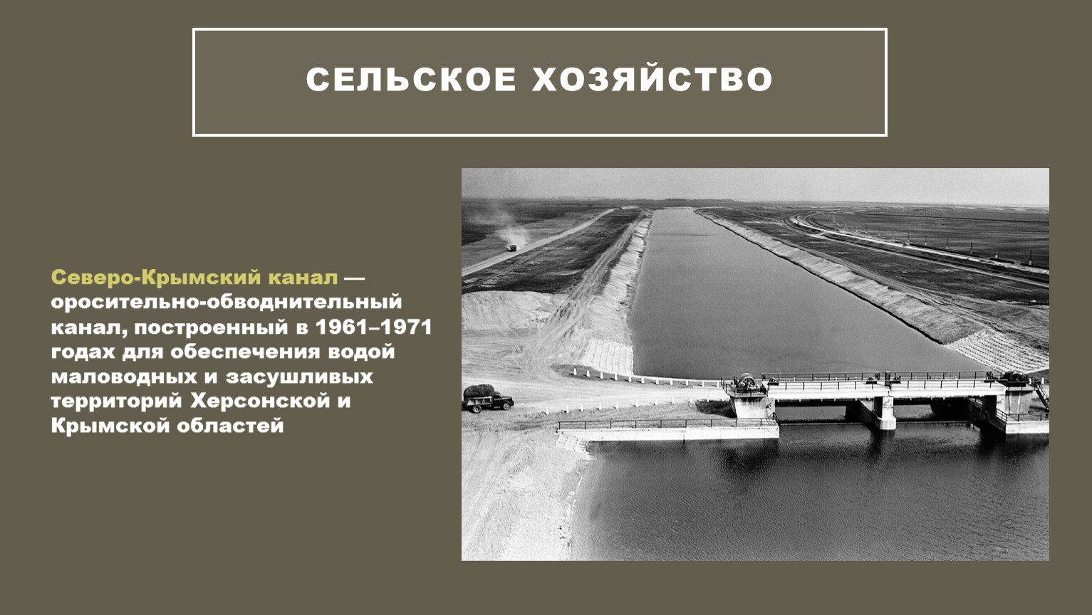 Северо-Крымский канал — оросительно-обводнительный канал, построенный в 1961–1971 годах для обеспечения водой маловодных и засушливых территорий Херсонской и Крымской областей