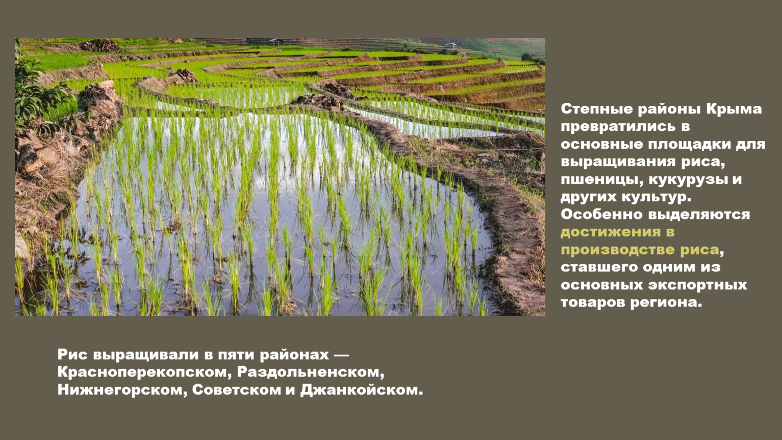 Рис выращивали в пяти районах — Красноперекопском, Раздольненском, Нижнегорском, Советском и Джанкойском.