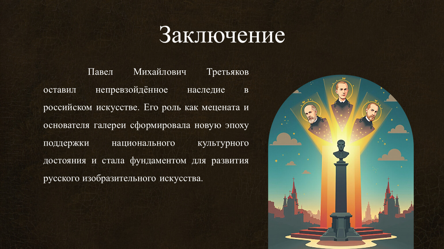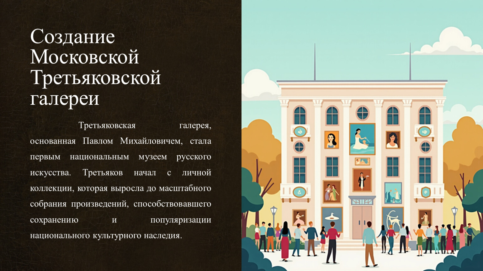 Третьяковская галерея, основанная Павлом Михайловичем, стала первым национальным музеем русского искусства. Третьяков начал с личной коллекции, которая выросла до масштабного собрания произведений, способствовавшего сохранению и популяризации национального культурного наследия.