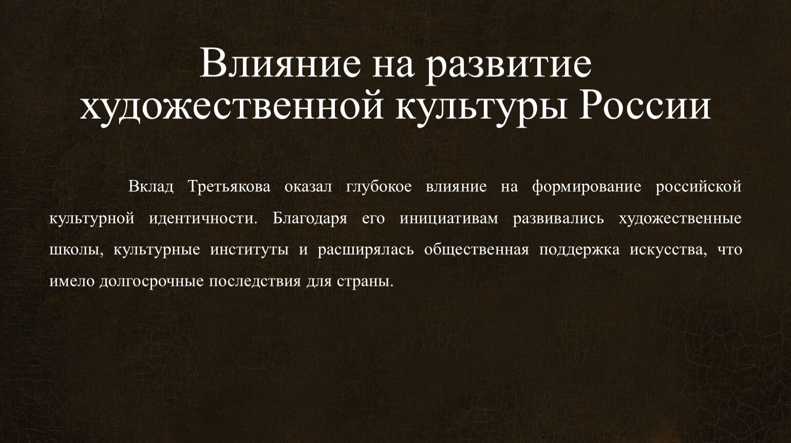 Вклад Третьякова оказал глубокое влияние на формирование российской культурной идентичности. Благодаря его инициативам развивались художественные школы, культурные институты и расширялась общественная поддержка искусства, что имело долгосрочные последствия для страны.