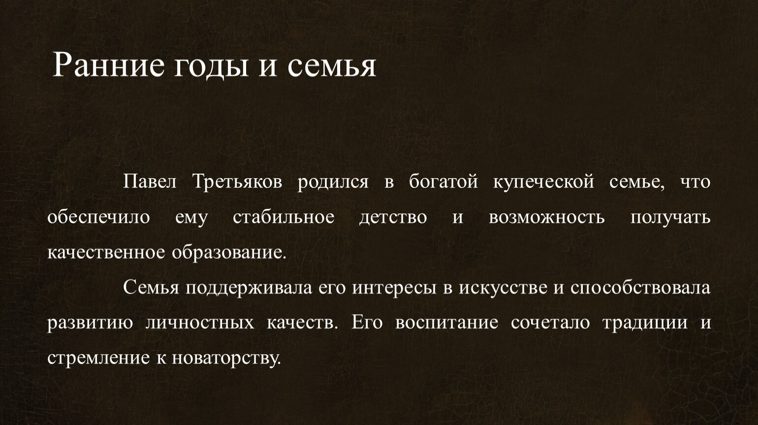 Павел Третьяков родился в богатой купеческой семье, что обеспечило ему стабильное детство и возможность получать качественное образование.