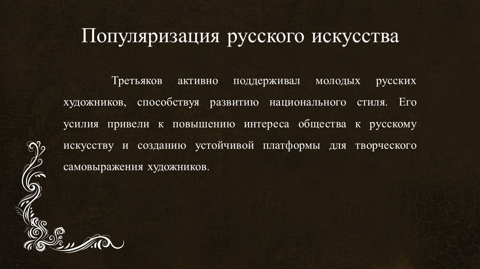 Третьяков активно поддерживал молодых русских художников, способствуя развитию национального стиля. Его усилия привели к повышению интереса общества к русскому искусству и созданию устойчивой платформы для творческого самовыражения художников.