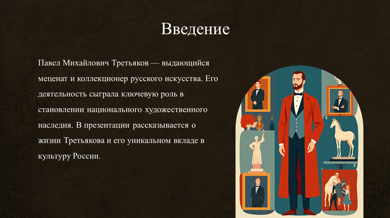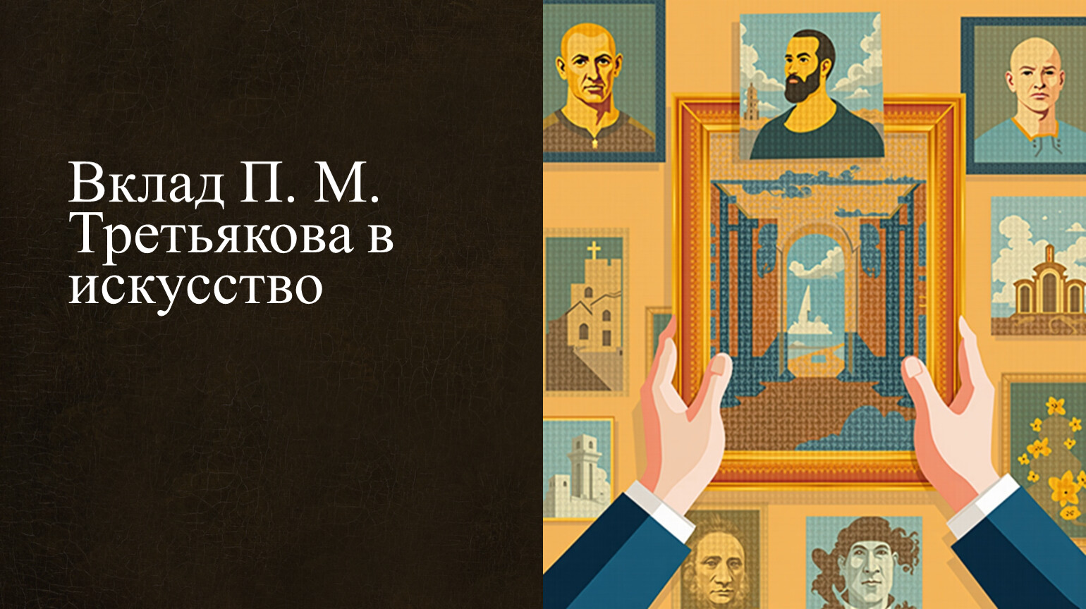 Павел Михайлович Третьяков — выдающийся меценат и коллекционер русского искусства. Его деятельность сыграла ключевую роль в становлении национального художественного наследия. В презентации рассказывается о жизни Третьякова и его уникальном вкладе в культуру России.