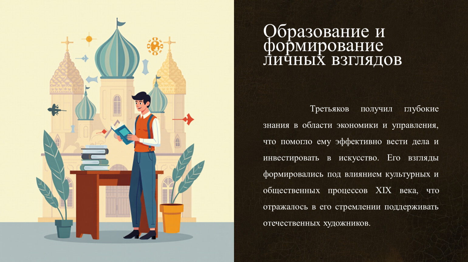 Третьяков получил глубокие знания в области экономики и управления, что помогло ему эффективно вести дела и инвестировать в искусство. Его взгляды формировались под влиянием культурных и общественных процессов XIX века, что отражалось в его стремлении поддерживать отечественных художников.