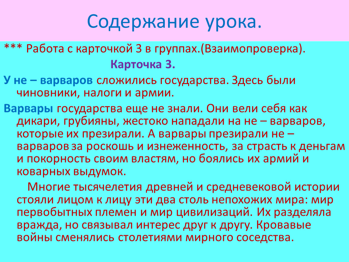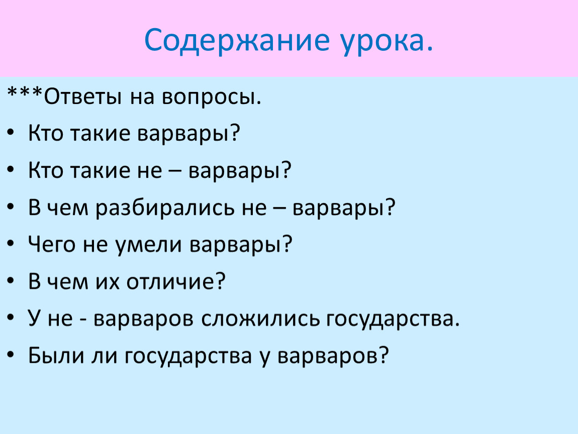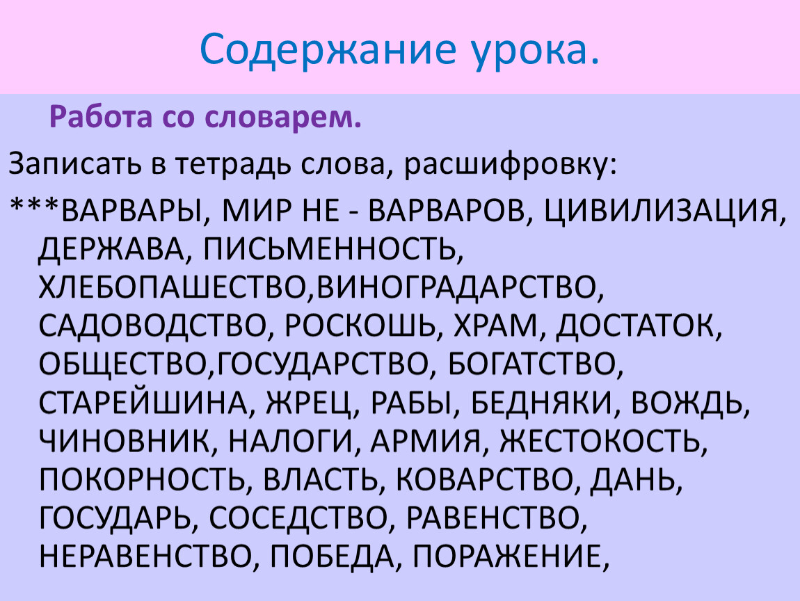 ***ВАРВАРЫ, МИР НЕ - ВАРВАРОВ, ЦИВИЛИЗАЦИЯ, ДЕРЖАВА, ПИСЬМЕННОСТЬ, ХЛЕБОПАШЕСТВО,ВИНОГРАДАРСТВО, САДОВОДСТВО, РОСКОШЬ, ХРАМ, ДОСТАТОК, ОБЩЕСТВО,ГОСУДАРСТВО, БОГАТСТВО, СТАРЕЙШИНА, ЖРЕЦ, РАБЫ, БЕДНЯКИ, ВОЖДЬ, ЧИНОВНИК, НАЛОГИ, АРМИЯ, ЖЕСТОКОСТЬ, ПОКОРНОСТЬ, ВЛАСТЬ, КОВАРСТВО, ДАНЬ, ГОСУДАРЬ, СОСЕДСТВО, РАВЕНСТВО, НЕРАВЕНСТВО, ПОБЕДА, ПОРАЖЕНИЕ,