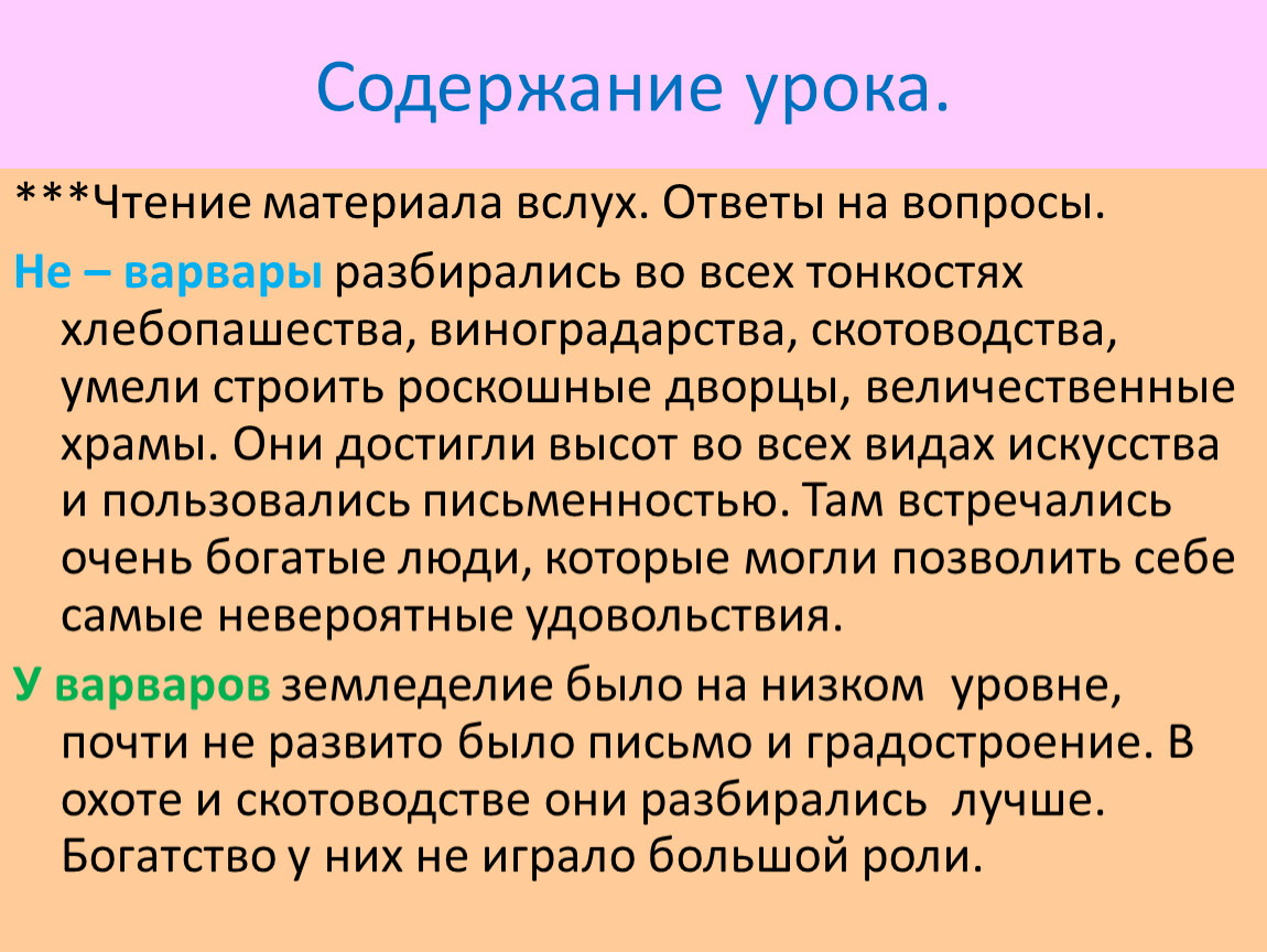 Не – варвары разбирались во всех тонкостях хлебопашества, виноградарства, скотоводства, умели строить роскошные дворцы, величественные храмы. Они достигли высот во всех видах искусства и пользовались письменностью. Там встречались очень богатые люди, которые могли позволить себе самые невероятные удовольствия.