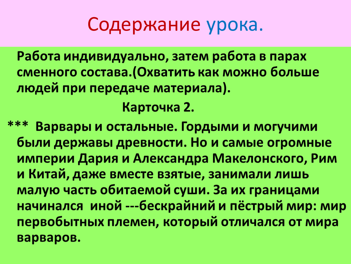 Работа индивидуально, затем работа в парах сменного состава.(Охватить как можно больше людей при передаче материала).
