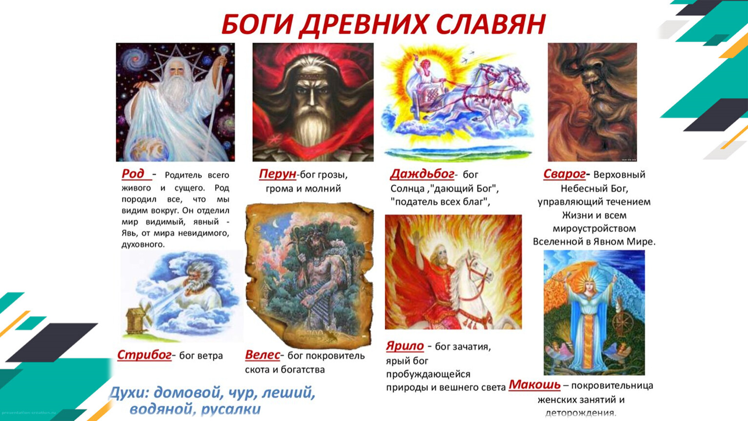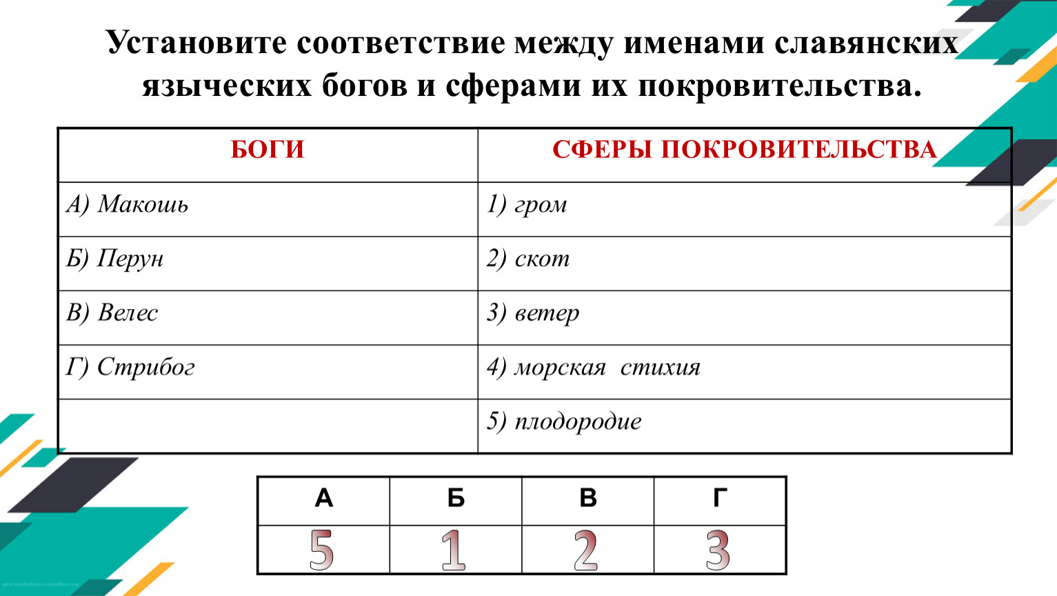 Установите соответствие между именами славянских языческих богов и сферами их покровительства.