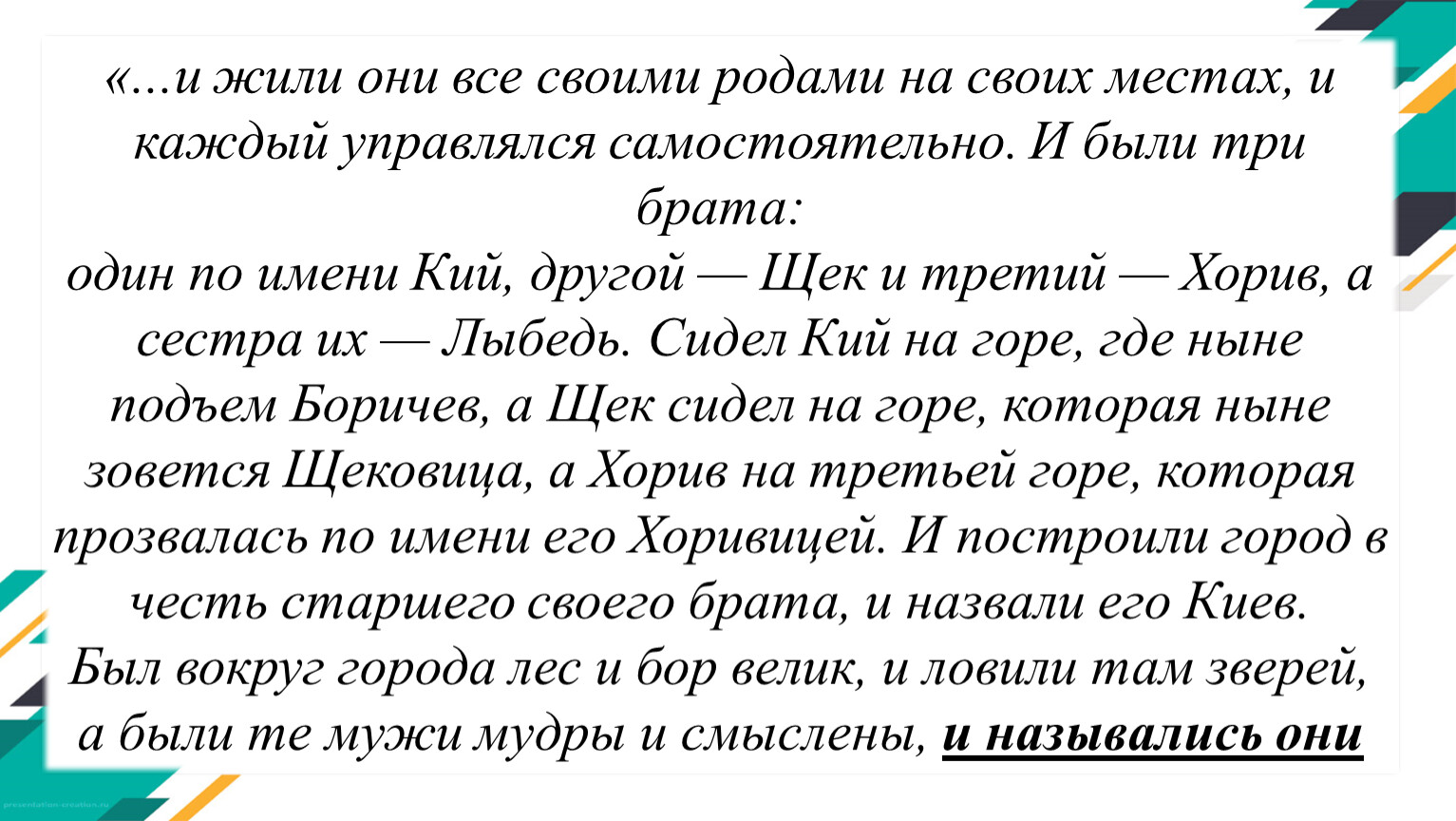 прозвалась по имени его Хоривицей. И построили город в честь старшего своего брата, и назвали его Киев.