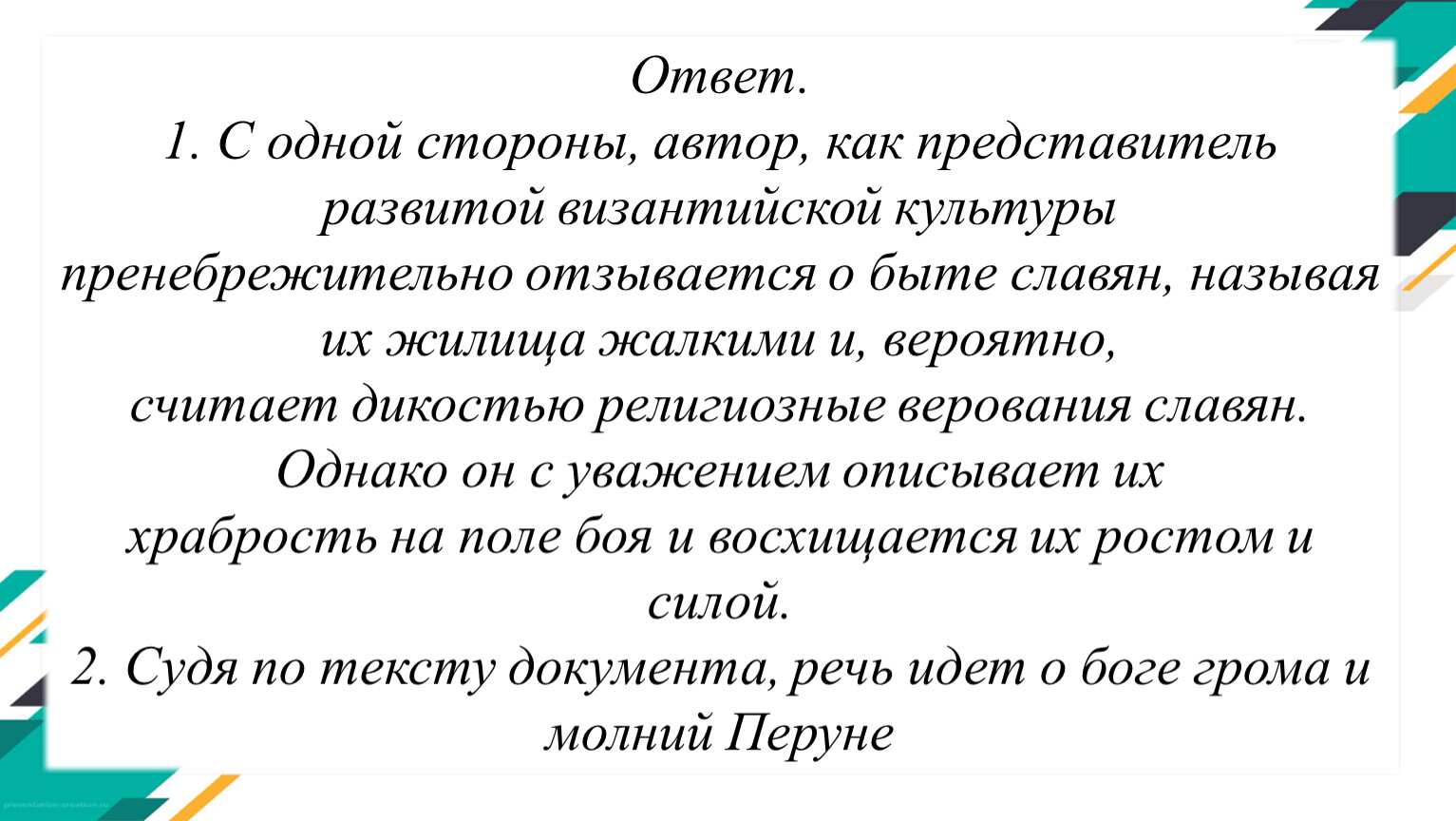 1. Оцените, как относится автор к славянам — уважительно, со страхом,