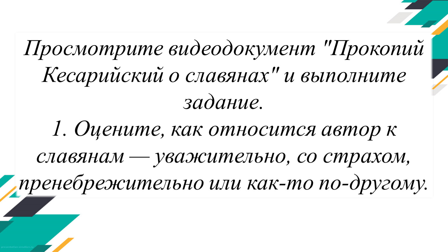 Просмотрите видеодокумент "Прокопий Кесарийский о славянах" и выполните задание.
