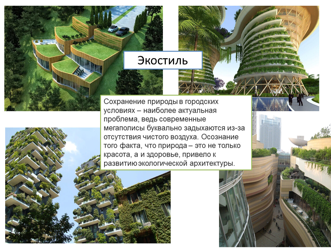 Сохранение природы в городских условиях – наиболее актуальная проблема, ведь современные мегаполисы буквально задыхаются из-за отсутствия чистого воздуха. Осознание того факта, что природа – это не только красота, а и здоровье, привело к развитию экологической архитектуры.