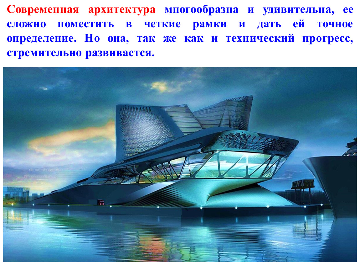Современная архитектура многообразна и удивительна, ее сложно поместить в четкие рамки и дать ей точное определение. Но она, так же как и технический прогресс, стремительно развивается.