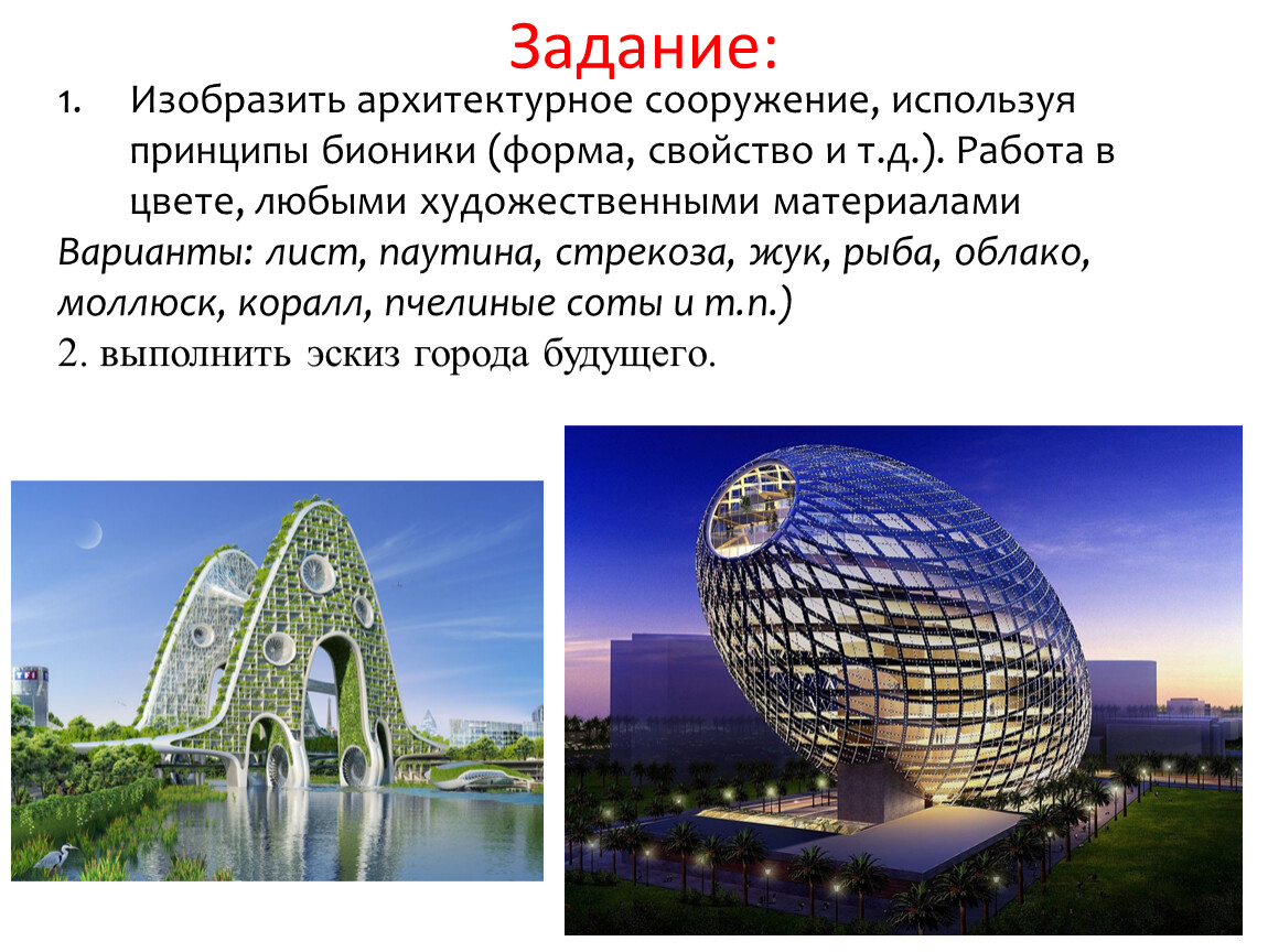 Изобразить архитектурное сооружение, используя принципы бионики (форма, свойство и т.д.). Работа в цвете, любыми художественными материалами