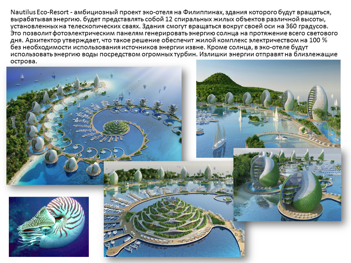 Nautilus Eco-Resort - амбициозный проект эко-отеля на Филиппинах, здания которого будут вращаться, вырабатывая энергию. будет представлять собой 12 спиральных жилых объектов различной высоты, установленных на телескопических сваях. Здания смогут вращаться вокруг своей оси на 360 градусов. Это позволит фотоэлектрическим панелям генерировать энергию солнца на протяжение всего светового дня. Архитектор утверждает, что такое решение обеспечит жилой комплекс электричеством на 100 % без необходимости использования источников энергии извне. Кроме солнца, в эко-отеле будут использовать энергию воды посредством огромных турбин. Излишки энергии отправят на близлежащие острова.