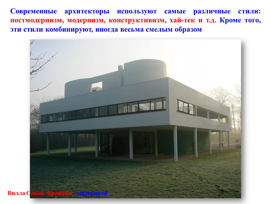 Современные архитекторы используют самые различные стили: постмодернизм, модернизм, конструктивизм, хай-тек и т.д. Кроме того, эти стили комбинируют, иногда весьма смелым образом
