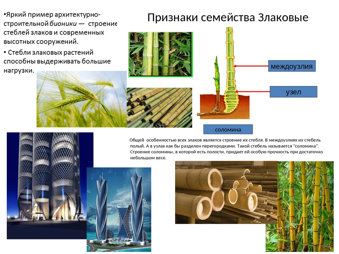 Яркий пример архитектурно-строительной бионики — строение стеблей злаков и современных высотных сооружений.