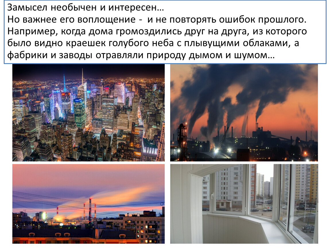 Но важнее его воплощение - и не повторять ошибок прошлого. Например, когда дома громоздились друг на друга, из которого было видно краешек голубого неба с плывущими облаками, а фабрики и заводы отравляли природу дымом и шумом…