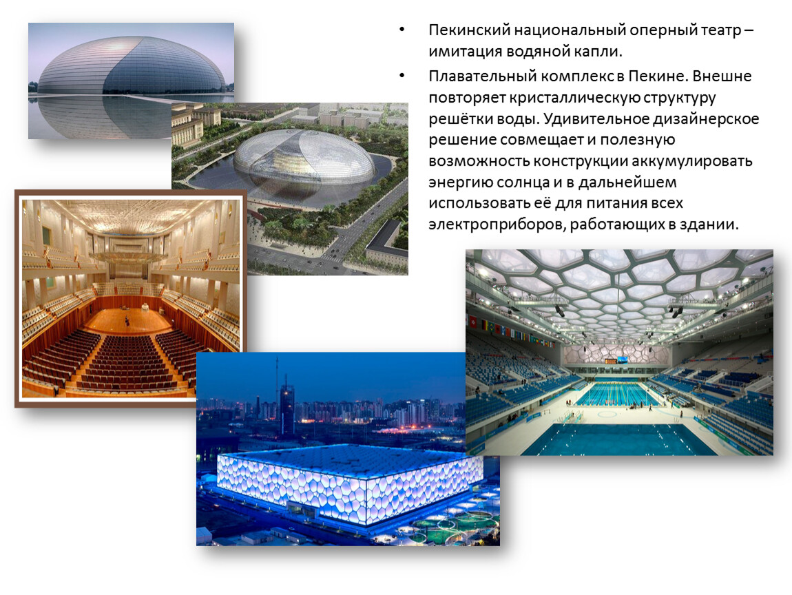Плавательный комплекс в Пекине. Внешне повторяет кристаллическую структуру решётки воды. Удивительное дизайнерское решение совмещает и полезную возможность конструкции аккумулировать энергию солнца и в дальнейшем использовать её для питания всех электроприборов, работающих в здании.