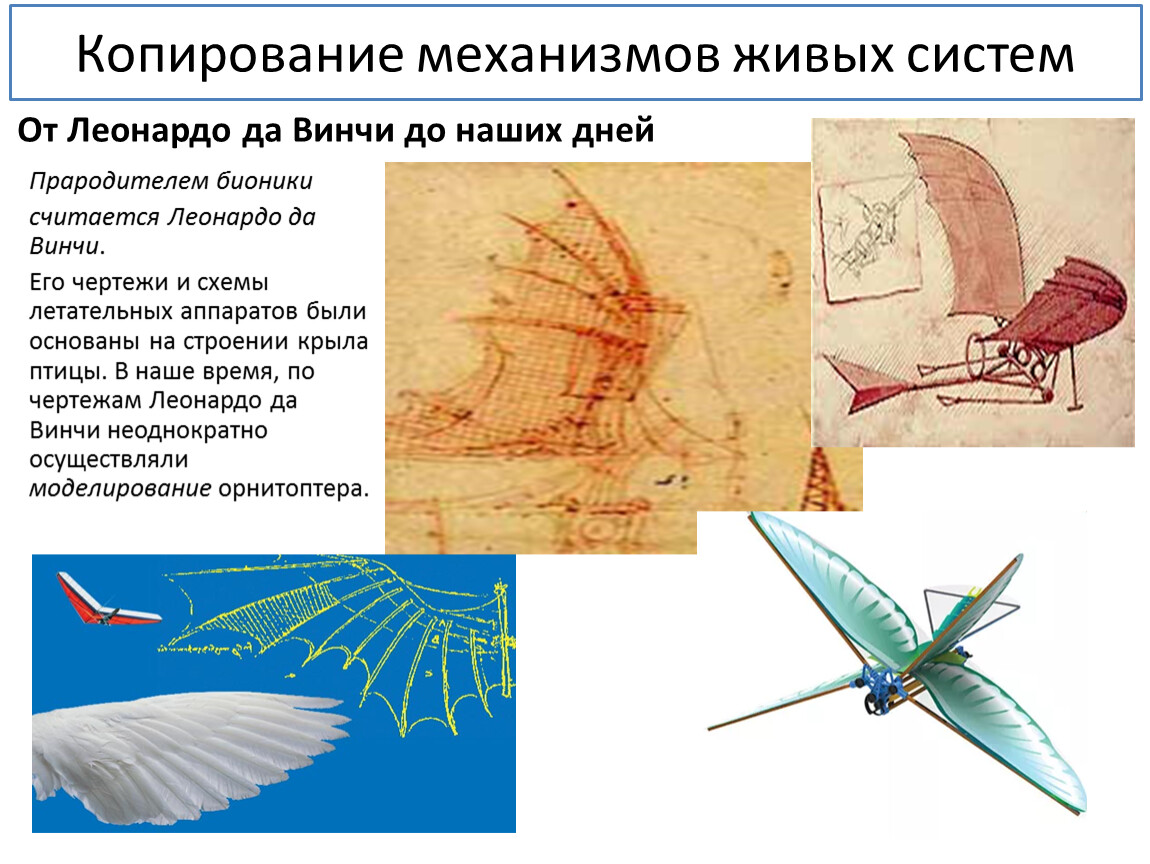 Его чертежи и схемы летательных аппаратов были основаны на строении крыла птицы. В наше время, по чертежам Леонардо да Винчи неоднократно осуществляли моделирование орнитоптера.