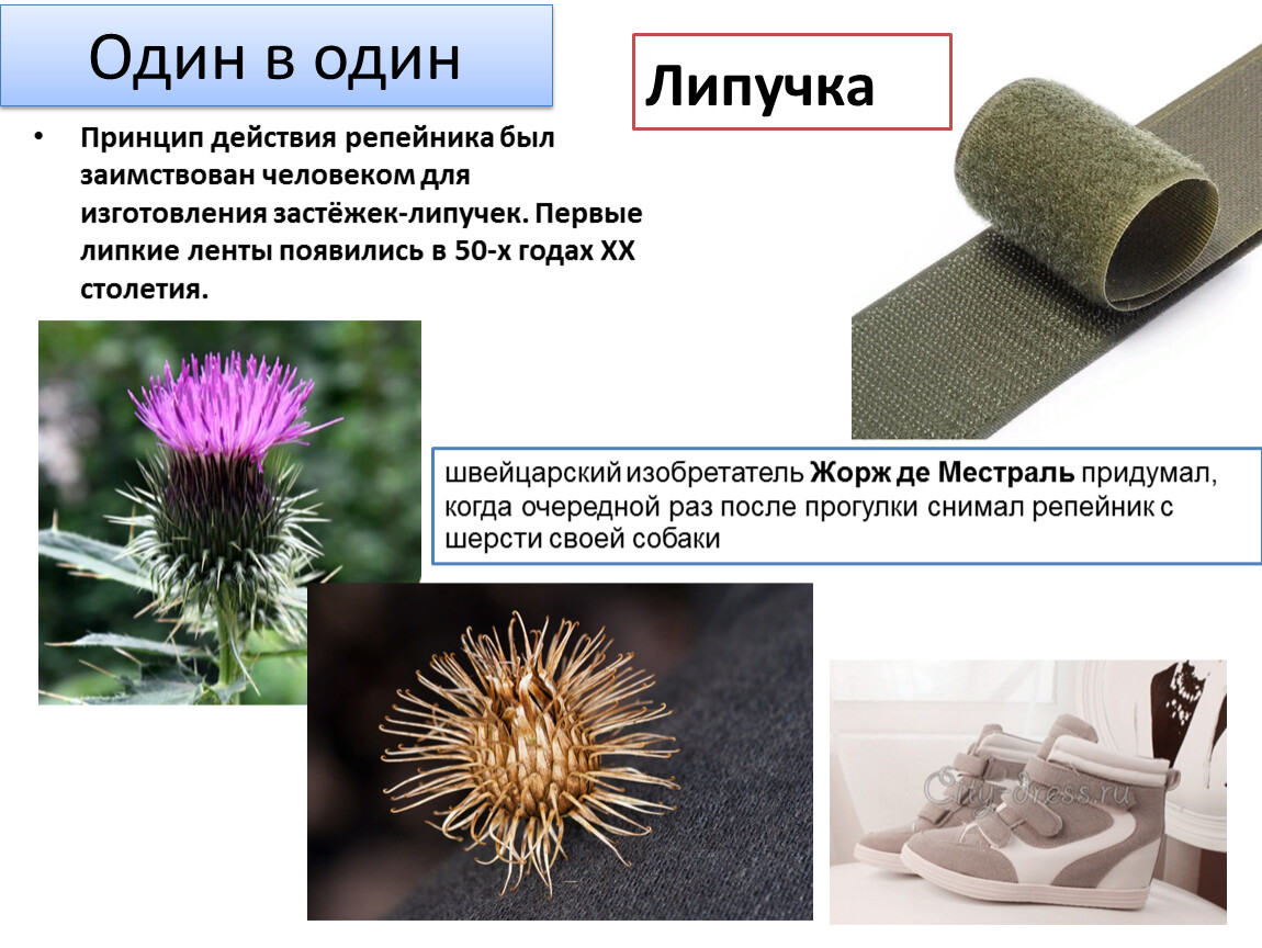 Принцип действия репейника был заимствован человеком для изготовления застёжек-липучек. Первые липкие ленты появились в 50-х годах XX столетия.