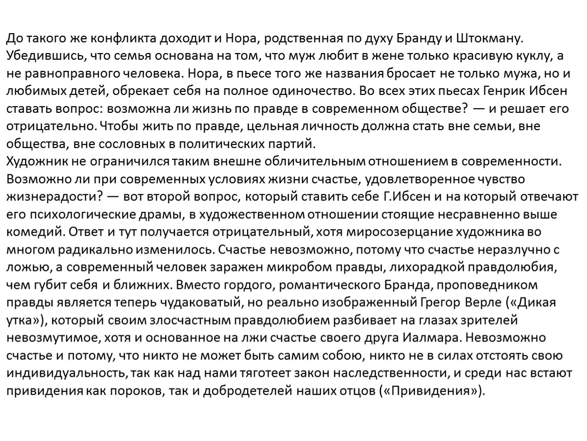 Художник не ограничился таким внешне обличительным отношением в современности. Возможно ли при современных условиях жизни счастье, удовлетворенное чувство жизнерадости? — вот второй вопрос, который ставить себе Г.Ибсен и на который отвечают его психологические драмы, в художественном отношении стоящие несравненно выше комедий. Ответ и тут получается отрицательный, хотя миросозерцание художника во многом радикально изменилось. Счастье невозможно, потому что счастье неразлучно с ложью, а современный человек заражен микробом правды, лихорадкой правдолюбия, чем губит себя и ближних. Вместо гордого, романтического Бранда, проповедником правды является теперь чудаковатый, но реально изображенный Грегор Верле («Дикая утка»), который своим злосчастным правдолюбием разбивает на глазах зрителей невозмутимое, хотя и основанное на лжи счастье своего друга Иалмара. Невозможно счастье и потому, что никто не может быть самим собою, никто не в силах отстоять свою индивидуальность, так как над нами тяготеет закон наследственности, и среди нас встают привидения как пороков, так и добродетелей наших отцов («Привидения»).