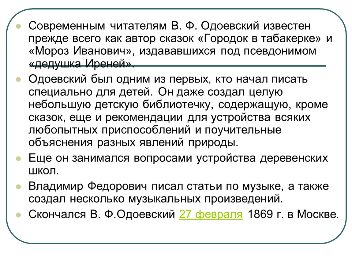 Современным читателям В. Ф. Одоевский известен прежде всего как автор сказок «Городок в табакерке» и «Мороз Иванович», издававшихся под псевдонимом «дедушка Иреней».