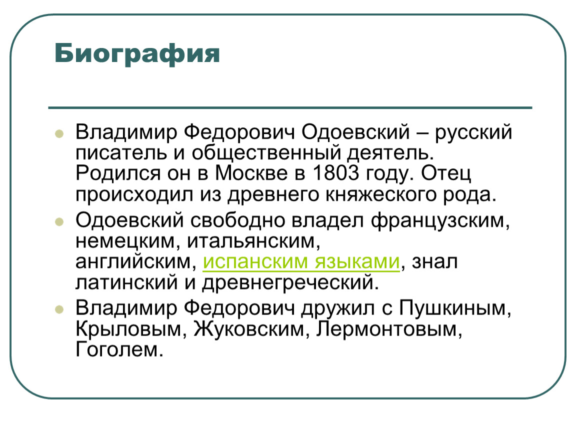Одоевский свободно владел французским, немецким, итальянским, английским, испанским языками, знал латинский и древнегреческий.