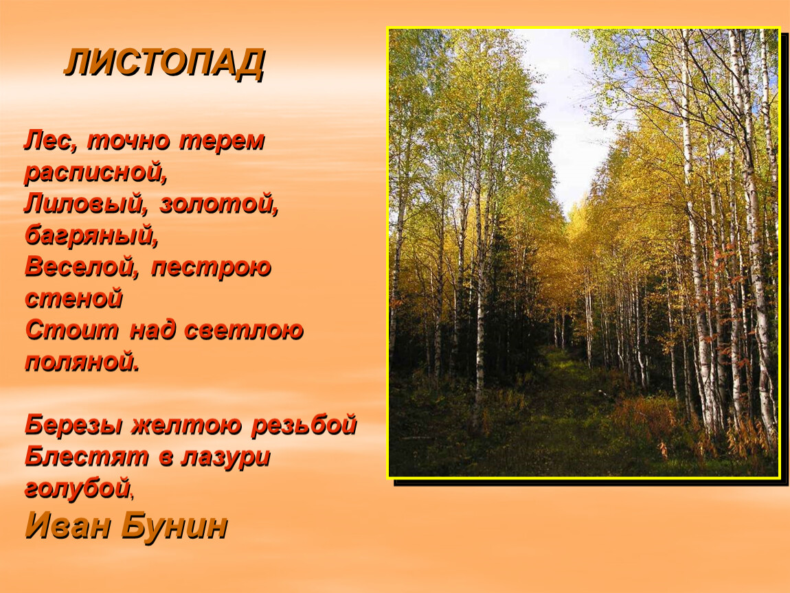 Лес, точно терем расписной,Лиловый, золотой, багряный,Веселой, пестрою стенойСтоит над светлою поляной.Березы желтою резьбойБлестят в лазури голубой,Иван Бунин