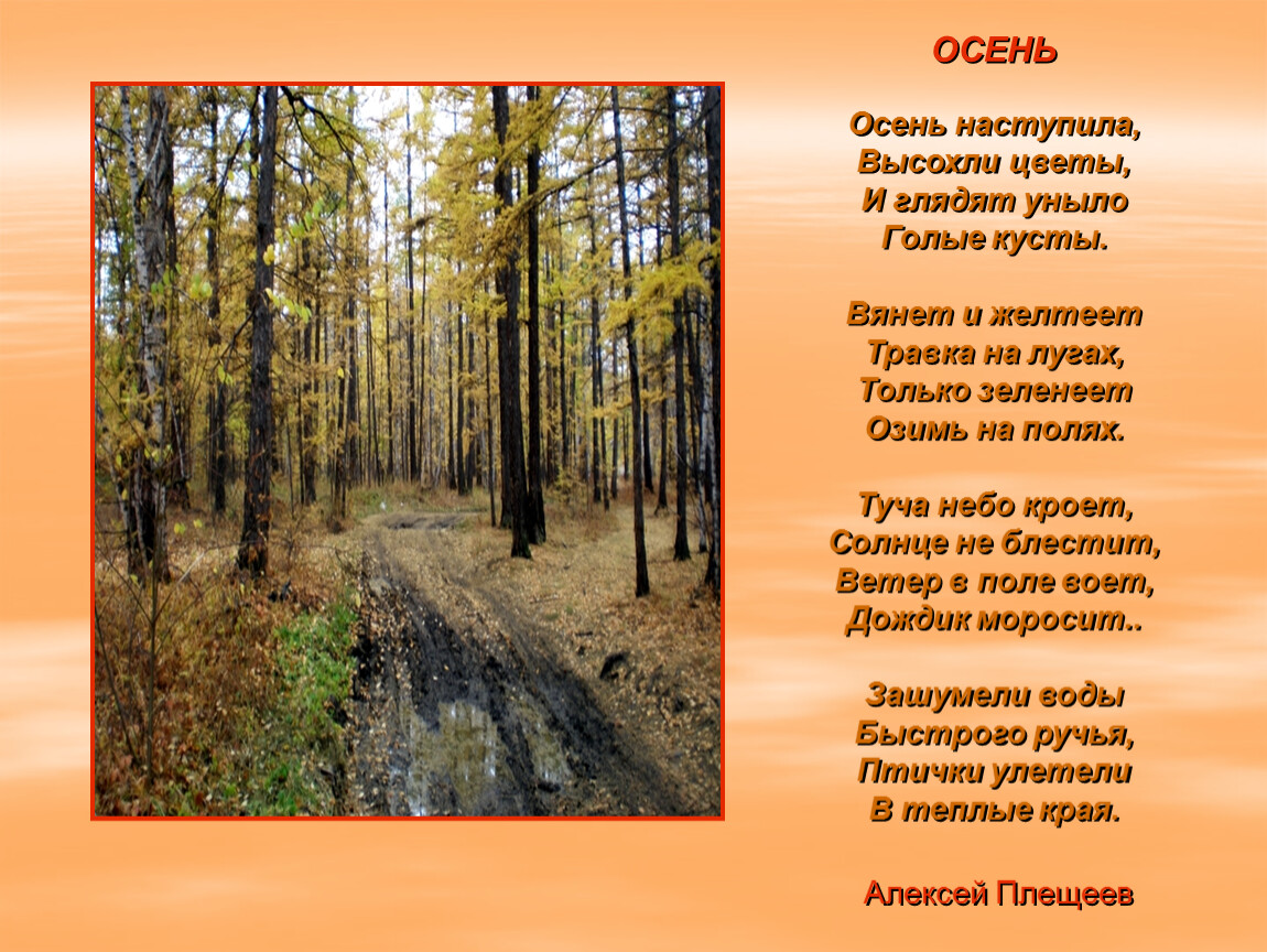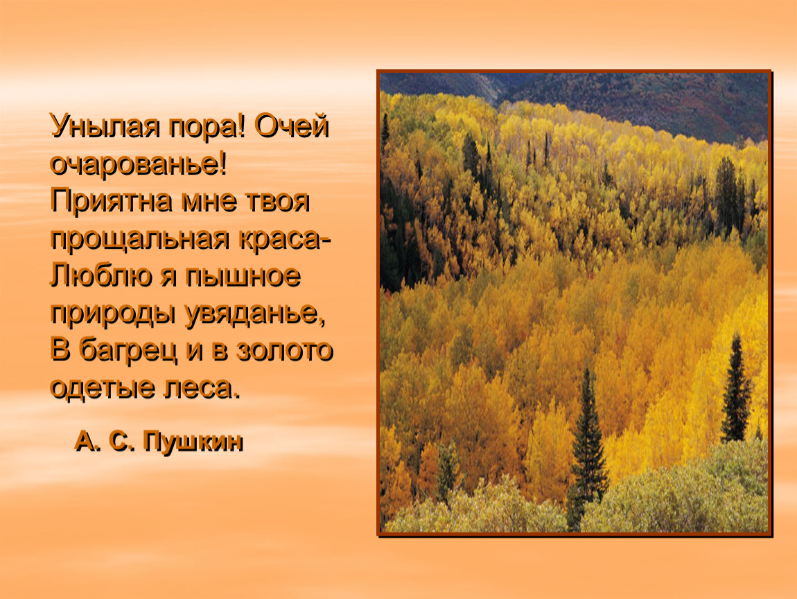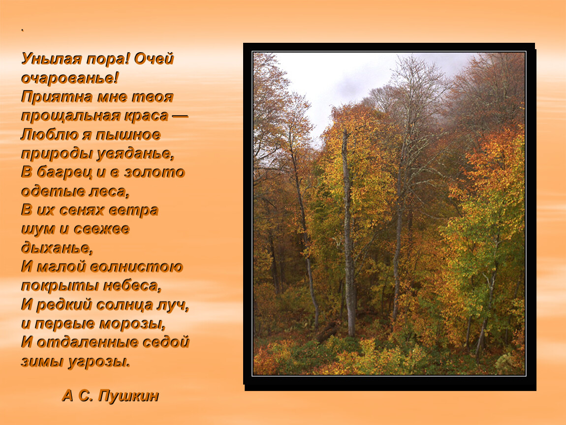 Унылая пора! Очей очарованье!Приятна мне твоя прощальная краса-Люблю я пышное природы увяданье,В багрец и в золото одетые леса.