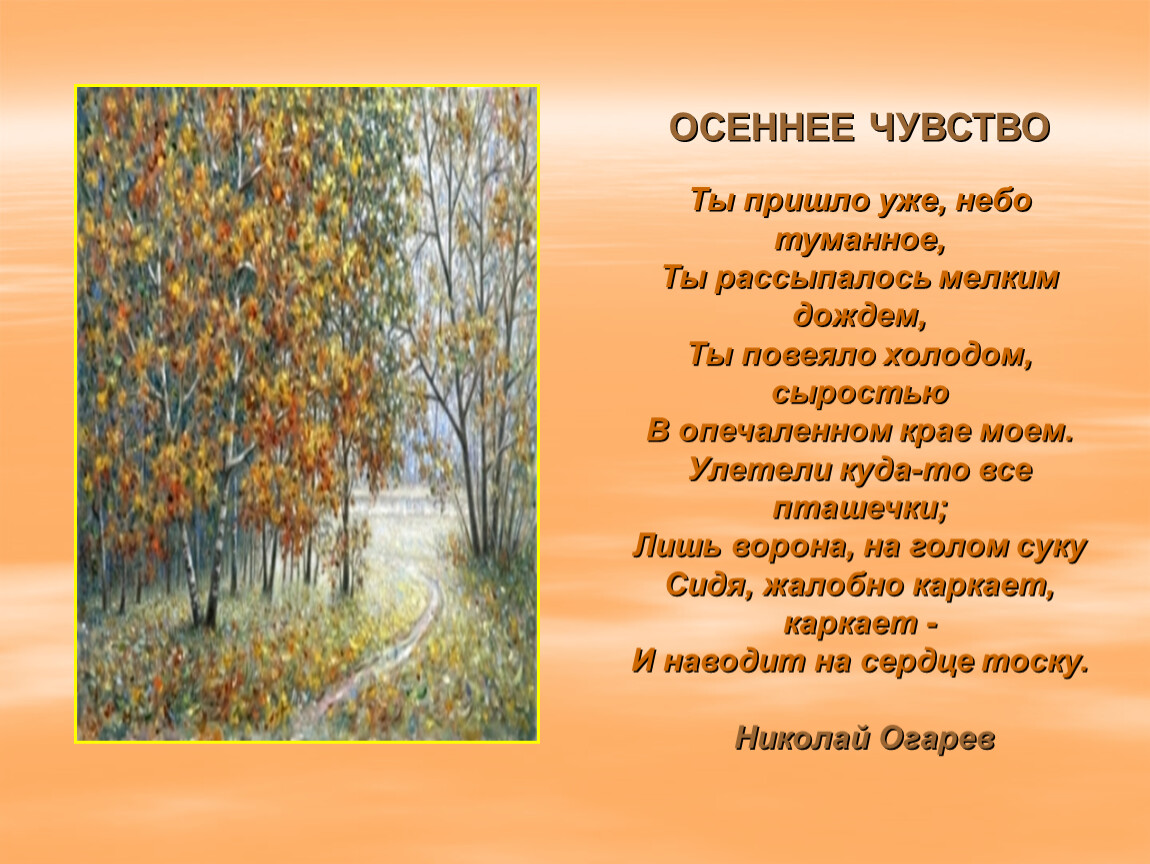 ОСЕННЕЕ ЧУВСТВОТы пришло уже, небо туманное,Ты рассыпалось мелким дождем,Ты повеяло холодом, сыростьюВ опечаленном крае моем.Улетели куда-то все пташечки;Лишь ворона, на голом сукуСидя, жалобно каркает, каркает -И наводит на сердце тоску. Николай Огарев