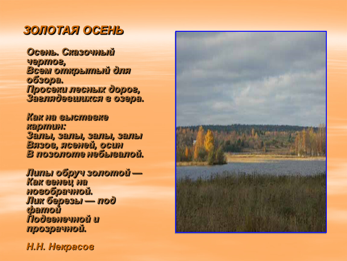 ЗОЛОТАЯ ОСЕНЬОсень. Сказочный чертог, Всем открытый для обзора. Просеки лесных дорог, Заглядевшихся в озера. Как на выставке картин: Залы, залы, залы, залы Вязов, ясеней, осин В позолоте небывалой. Липы обруч золотой — Как венец на новобрачной. Лик березы — под фатой Подвенечной и прозрачной. Н.Н. Некрасов