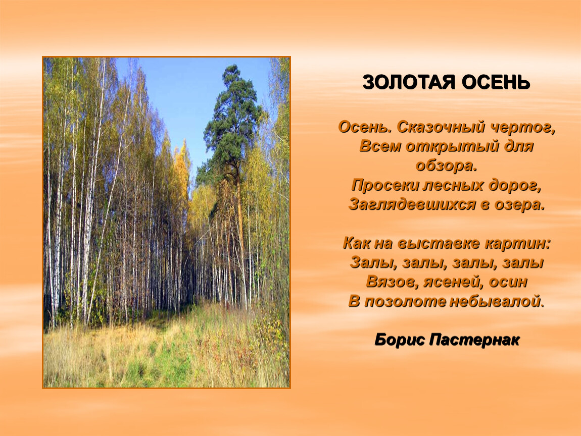 ЗОЛОТАЯ ОСЕНЬОсень. Сказочный чертог, Всем открытый для обзора. Просеки лесных дорог, Заглядевшихся в озера. Как на выставке картин: Залы, залы, залы, залы Вязов, ясеней, осин В позолоте небывалой. Борис Пастернак