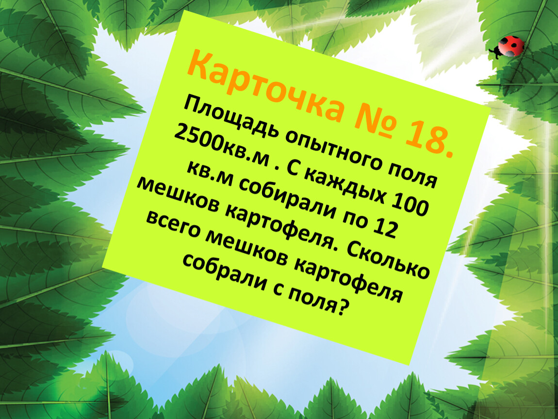 Карточка № 18.Площадь опытного поля 2500кв.м . С каждых 100 кв.м собирали по 12 мешков картофеля. Сколько всего мешков картофеля собрали с поля?