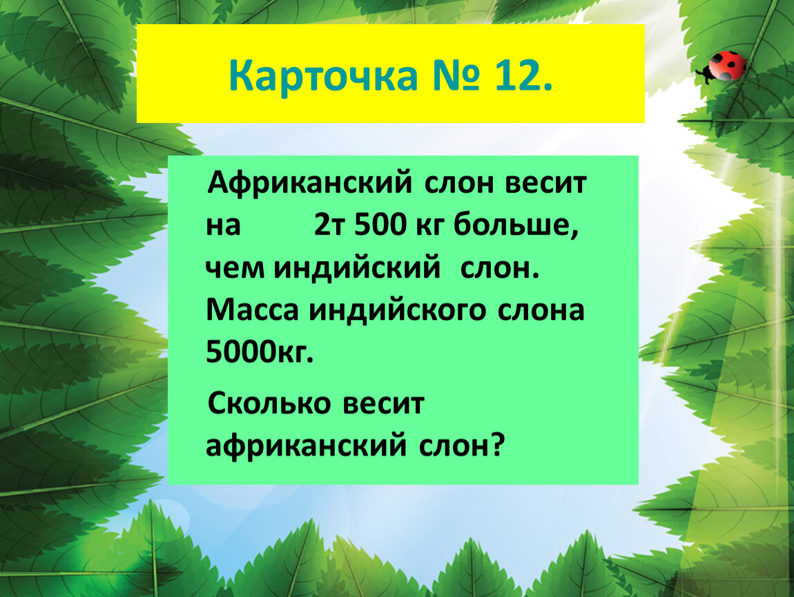 Африканский слон весит на 2т 500 кг больше, чем индийский слон. Масса индийского слона 5000кг.