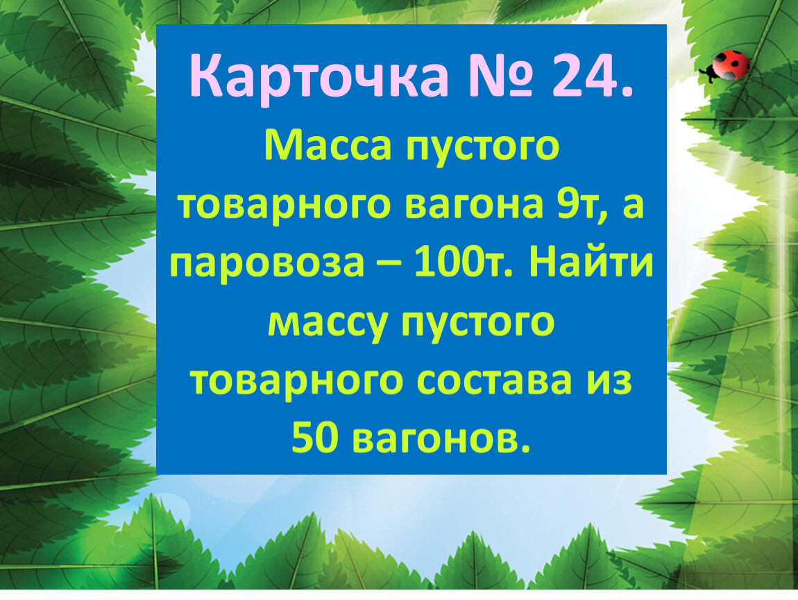 Карточка № 24.Масса пустого товарного вагона 9т, а паровоза – 100т. Найти массу пустого товарного состава из 50 вагонов.