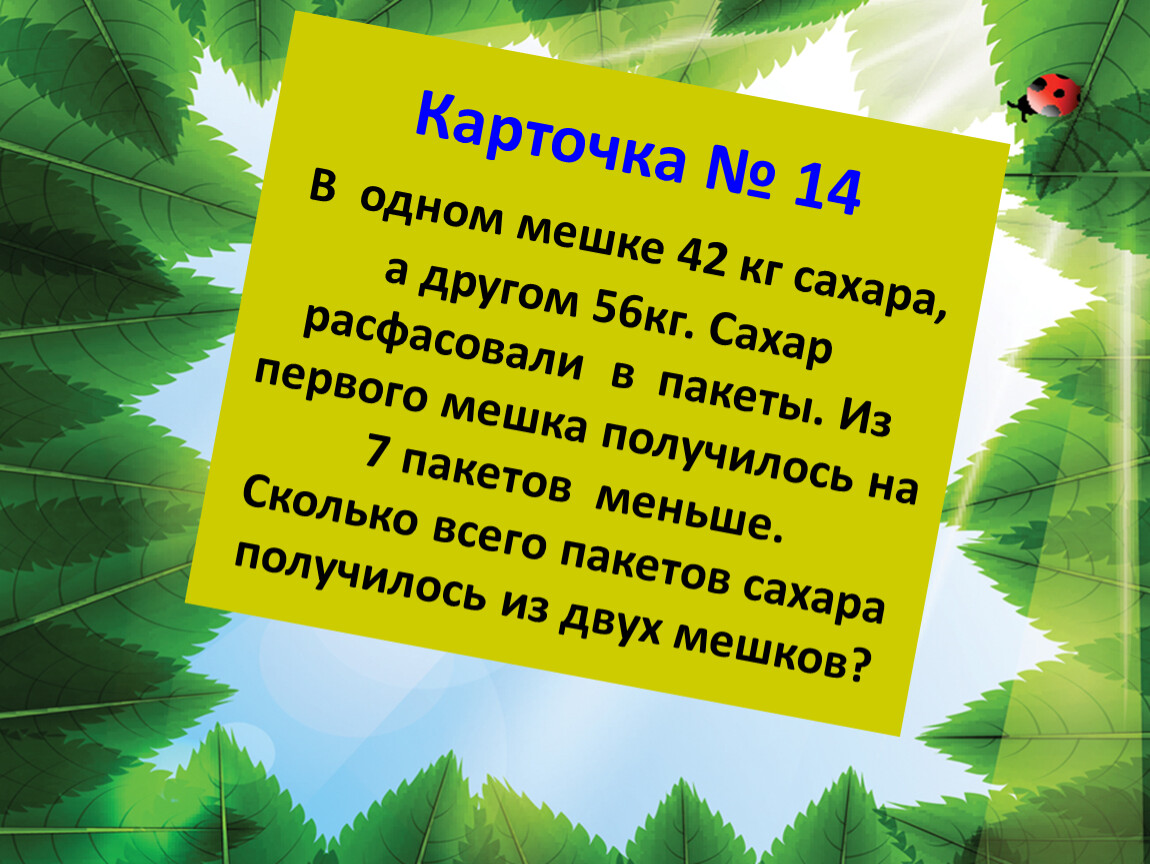 Карточка № 14 В одном мешке 42 кг сахара, а другом 56кг. Сахар расфасовали в пакеты. Из первого мешка получилось на 7 пакетов меньше. Сколько всего пакетов сахара получилось из двух мешков?
