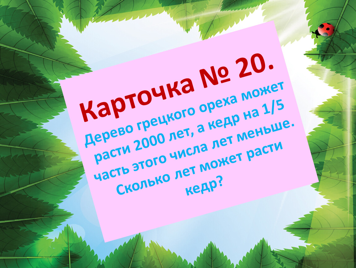 Карточка № 20.Дерево грецкого ореха может расти 2000 лет, а кедр на 1/5 часть этого числа лет меньше.Сколько лет может расти кедр?