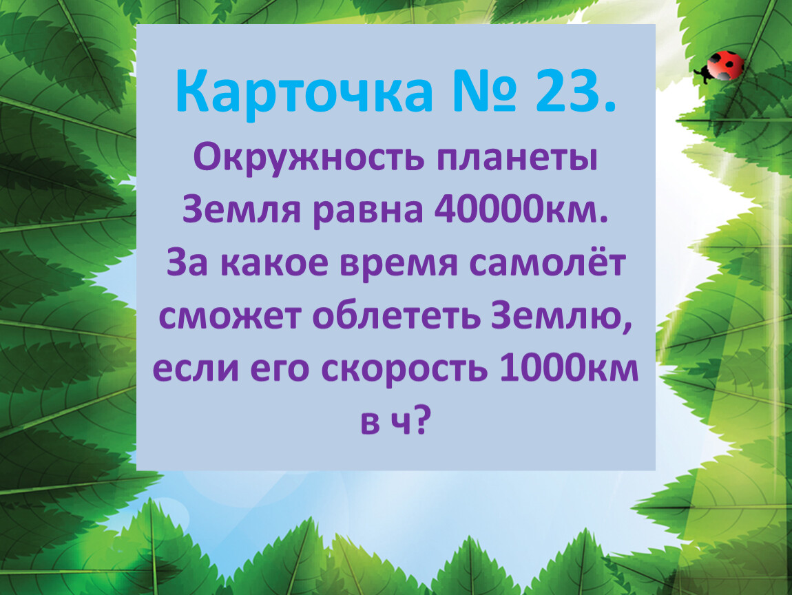 Карточка № 23.Окружность планеты Земля равна 40000км. За какое время самолёт сможет облететь Землю, если его скорость 1000км в ч?