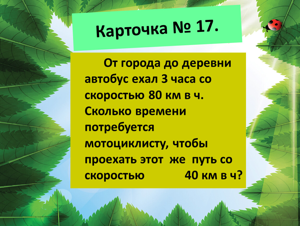 От города до деревни автобус ехал 3 часа со скоростью 80 км в ч. Сколько времени потребуется мотоциклисту, чтобы проехать этот же путь со скоростью 40 км в ч?