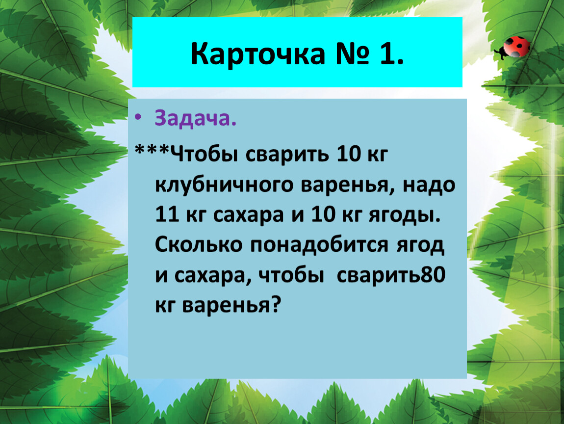 ***Чтобы сварить 10 кг клубничного варенья, надо 11 кг сахара и 10 кг ягоды. Сколько понадобится ягод и сахара, чтобы сварить80 кг варенья?