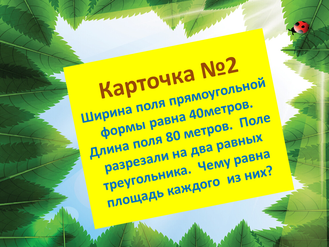 Карточка №2Ширина поля прямоугольной формы равна 40метров. Длина поля 80 метров. Поле разрезали на два равных треугольника. Чему равна площадь каждого из них?